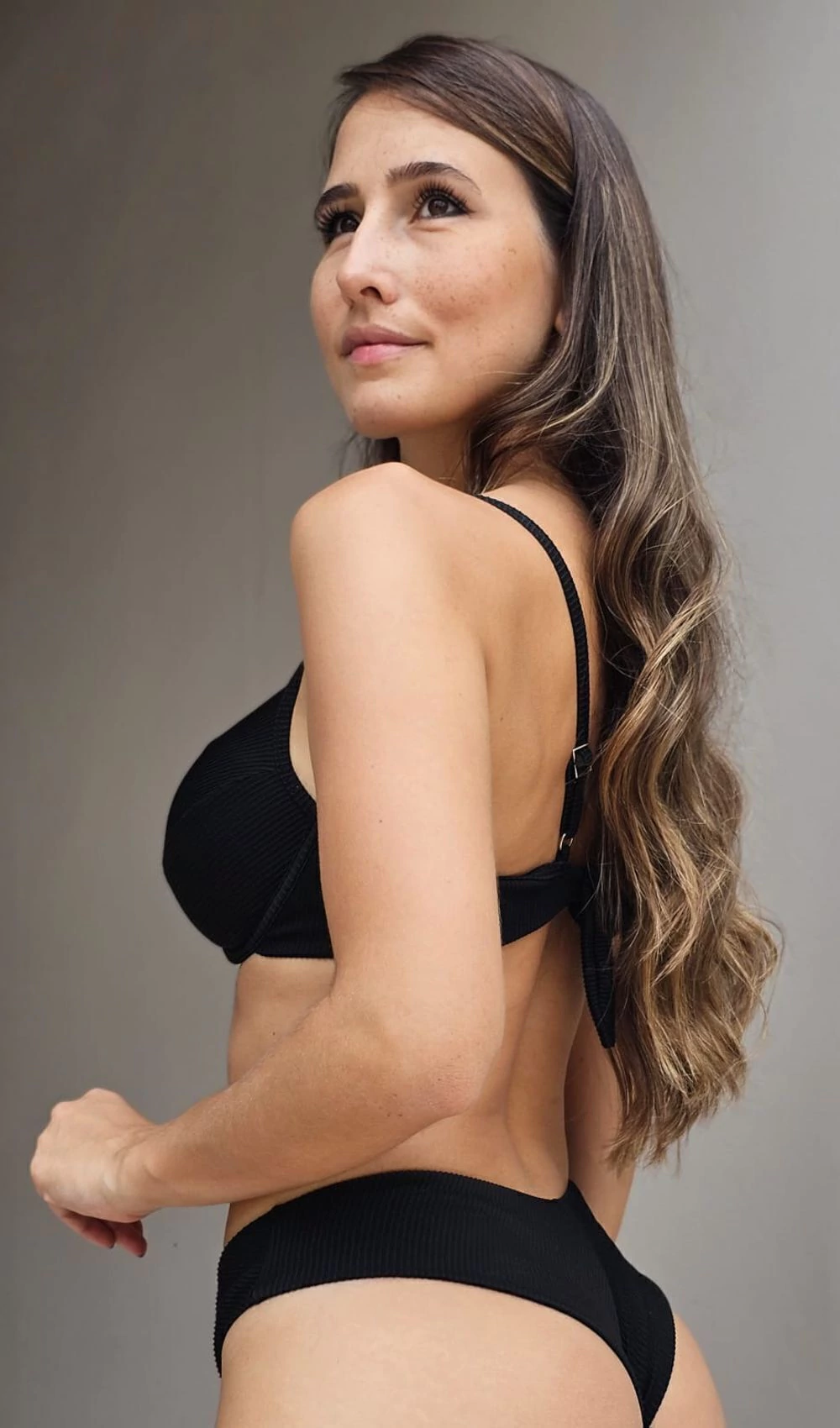 Conjunto de biquíni estilo meia taça com aro, bojo removível e alças fixas. Calcinha estilo asa delta fio duplo.