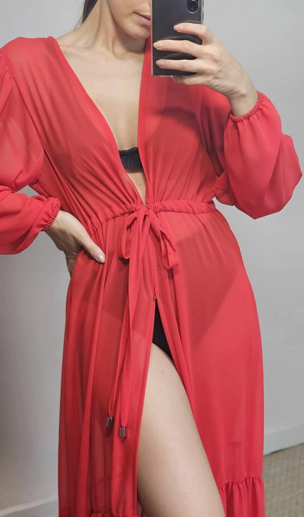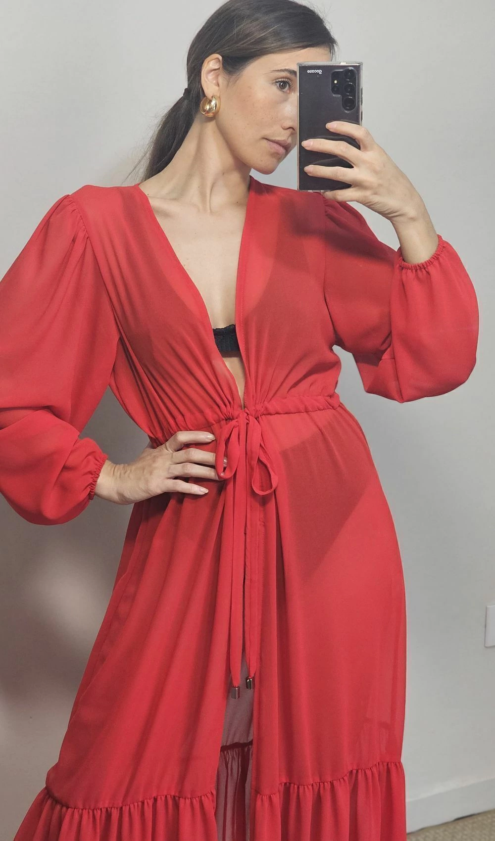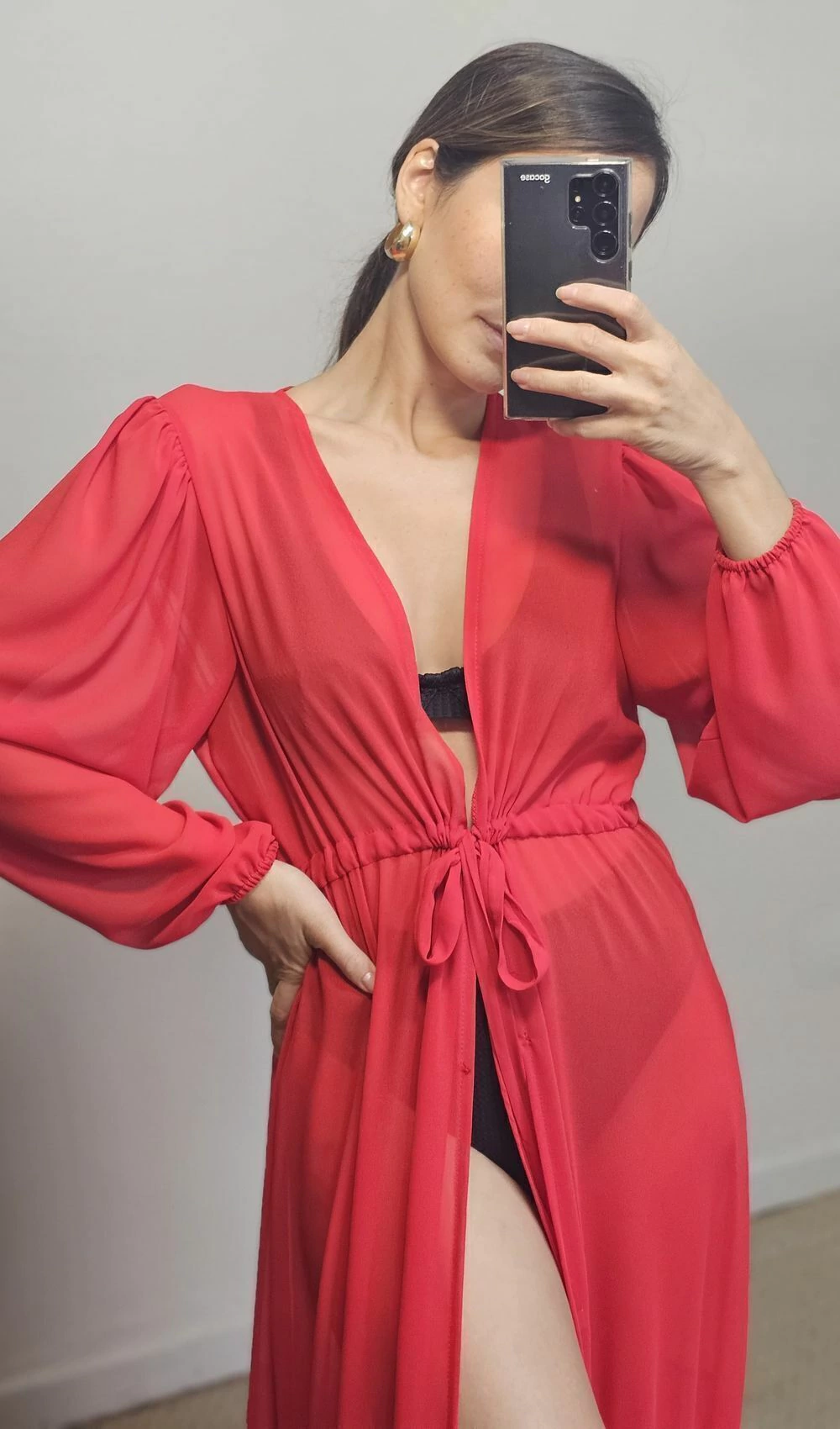 Saída de praia/piscina longa com detalhe no barrado, ajuste na cintura com gancho para fechamento logo abaixo, e mangas longas com punhos em elástico e ombros suavemente franzidos.
