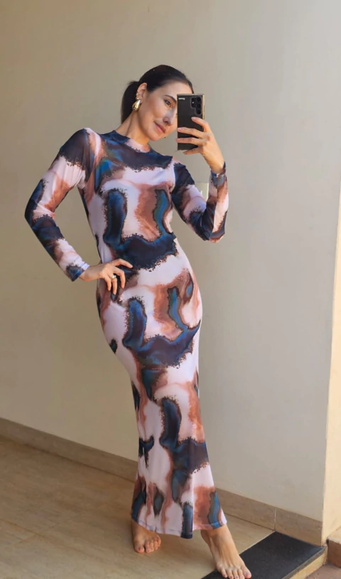 Saída de praia/piscina longa, reta, com mangas longas, fenda na parte de trás.